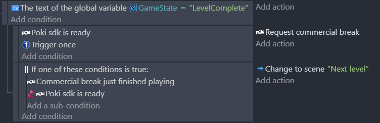 Ads can be displayed using either the Commercial break or Rewarded break actions. Please refer to Poki's ads best practices to understand when to use one or the other.