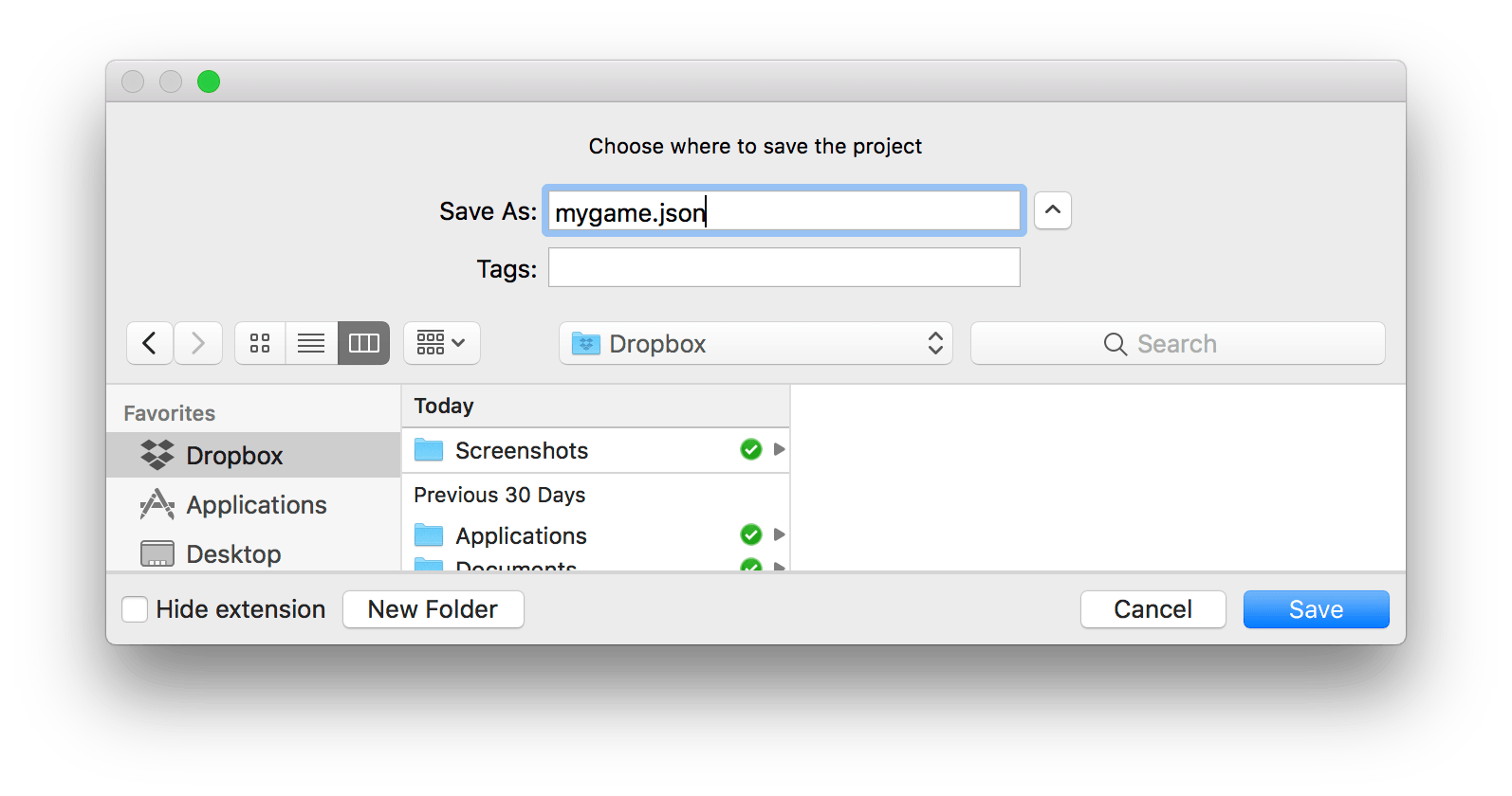 - Choose a folder, then enter a filename finishing by .json. For example: