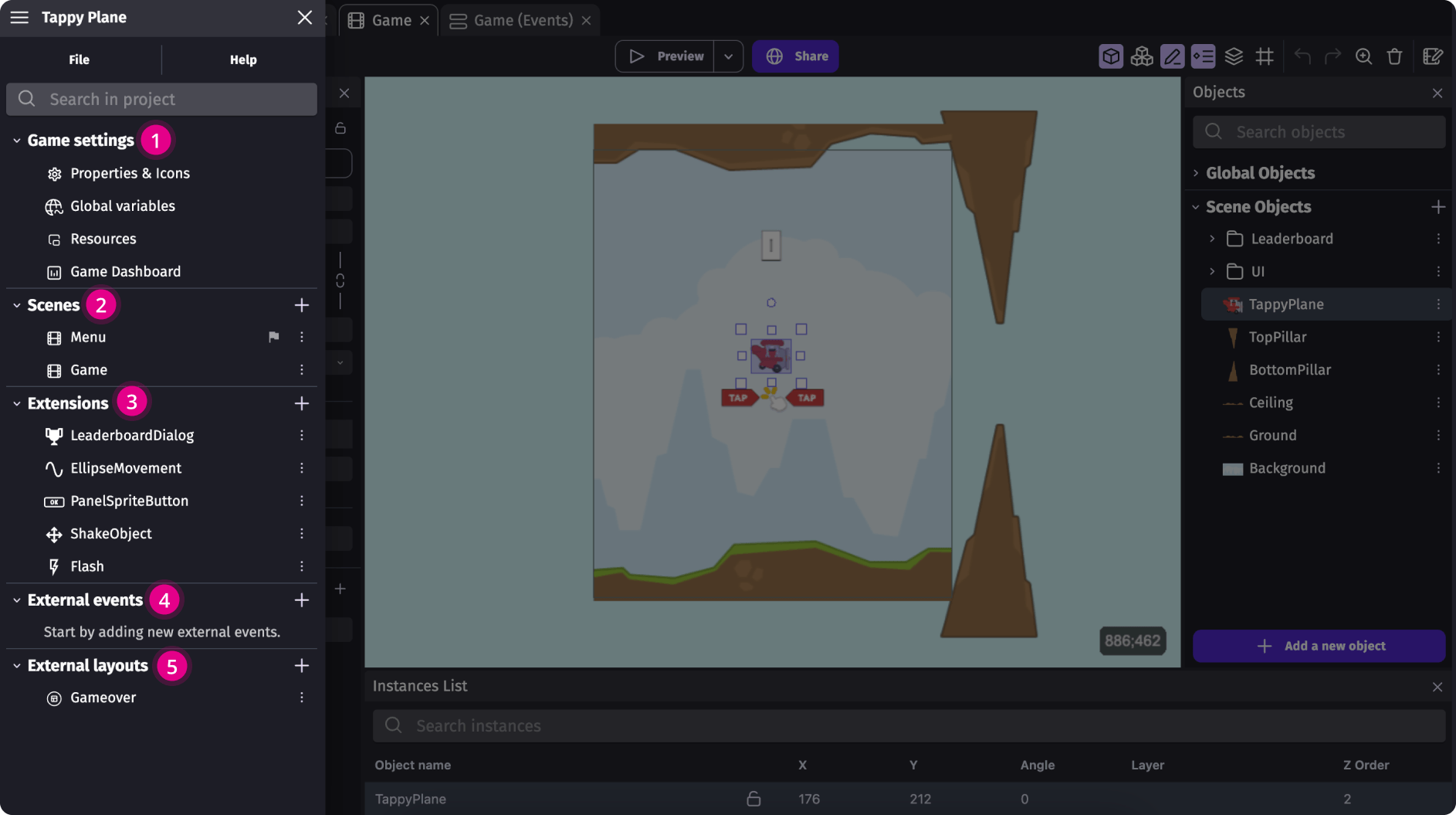 • 5.External layouts: Similar to external events, you can create an external layout for anything you want to use throughout your project(like UI and menu set ups), and then load them into any scene you choose. See External Layouts to learn how to use them.