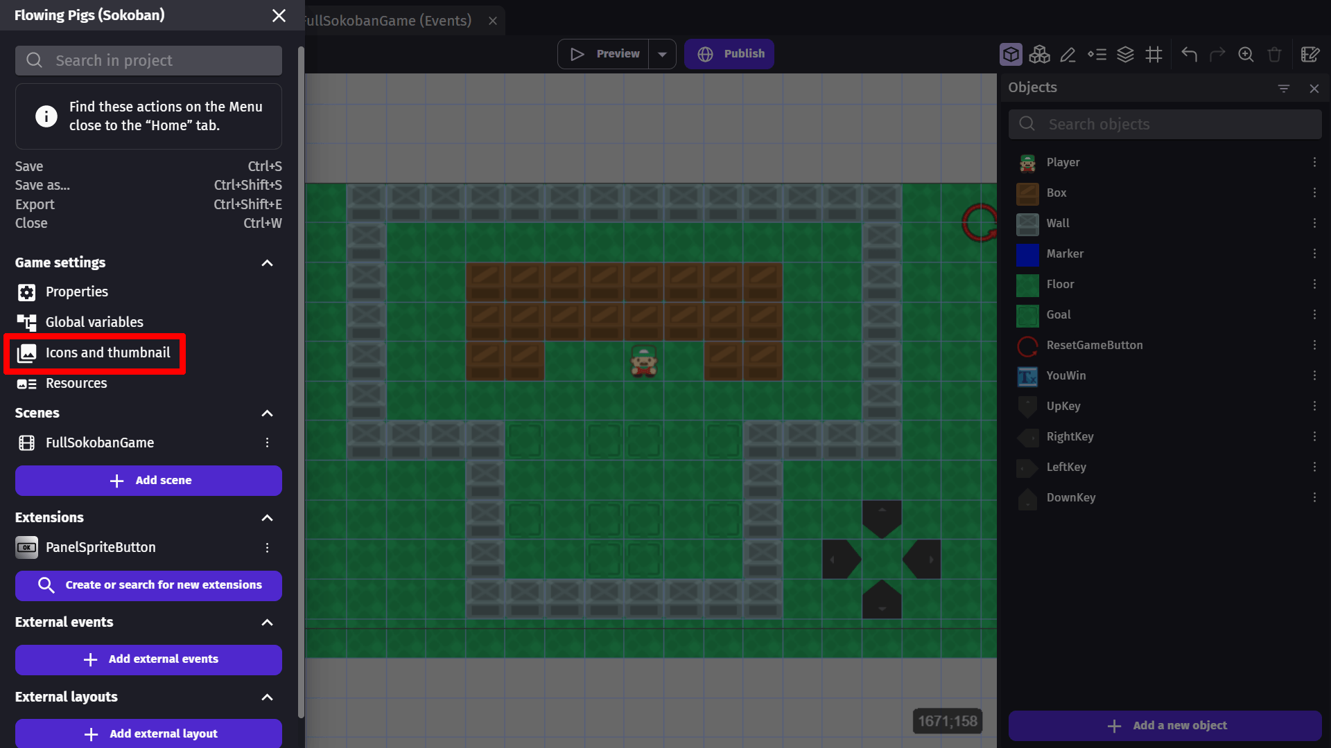 When you click on Icons and thumbnail in the Project Manager, a window is opened where you can set icons for the game that will be used when it's exported as a Windows/macOS/Linux app or an Android/iOS mobile game. In this window you can also add a thumbnail for your game to be used if it's published on GDevelop's games hosting platform gd.games.