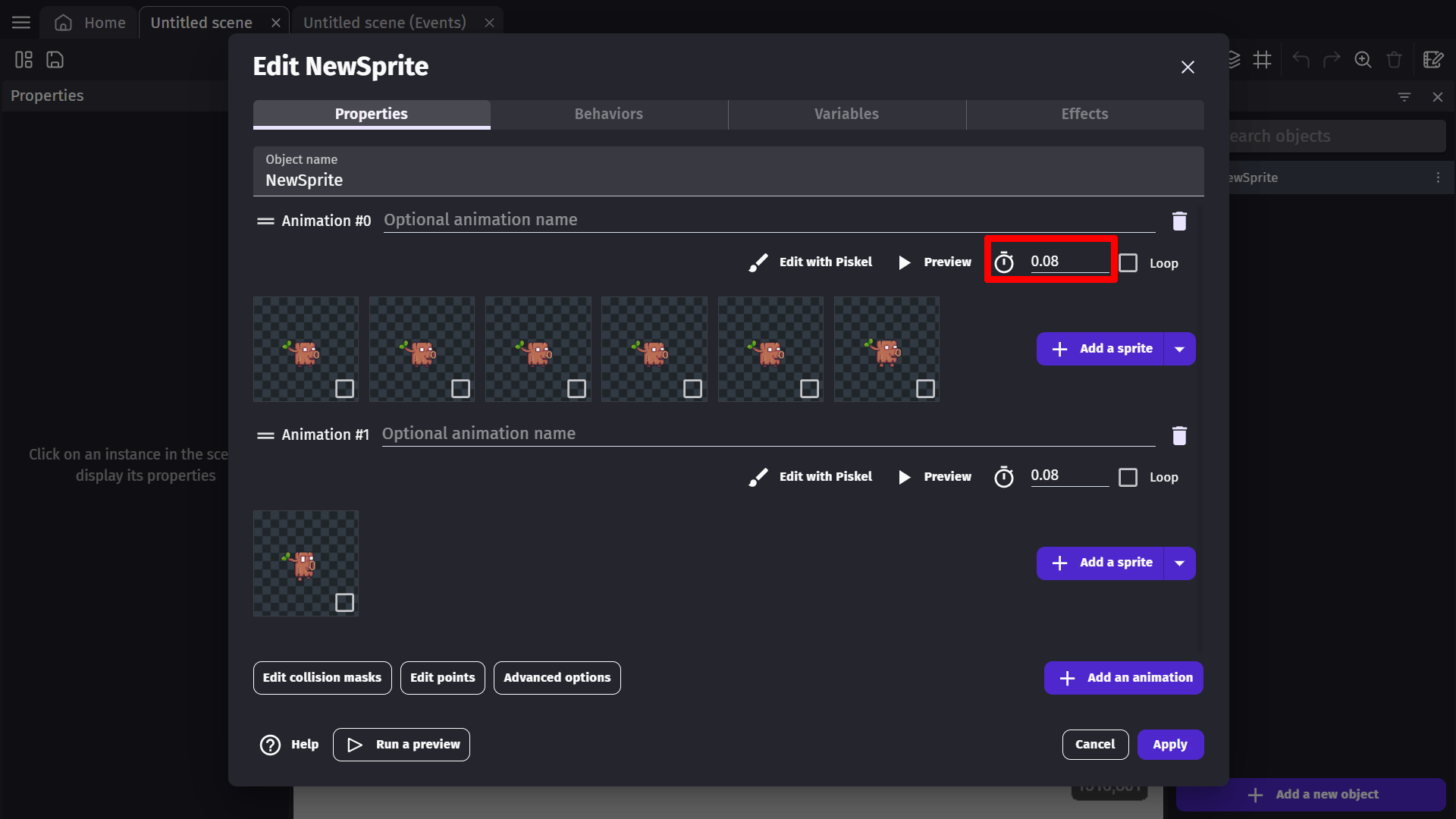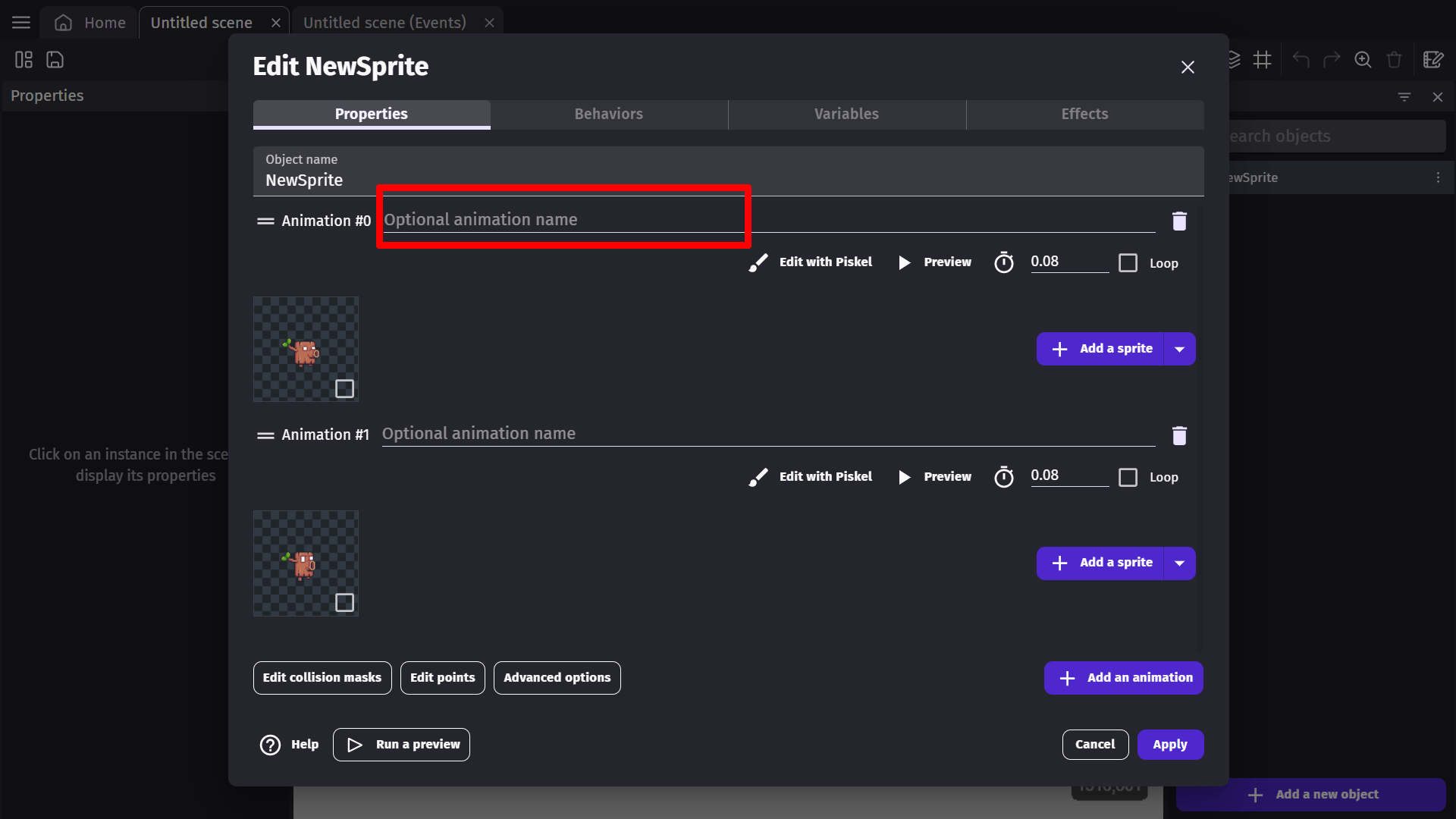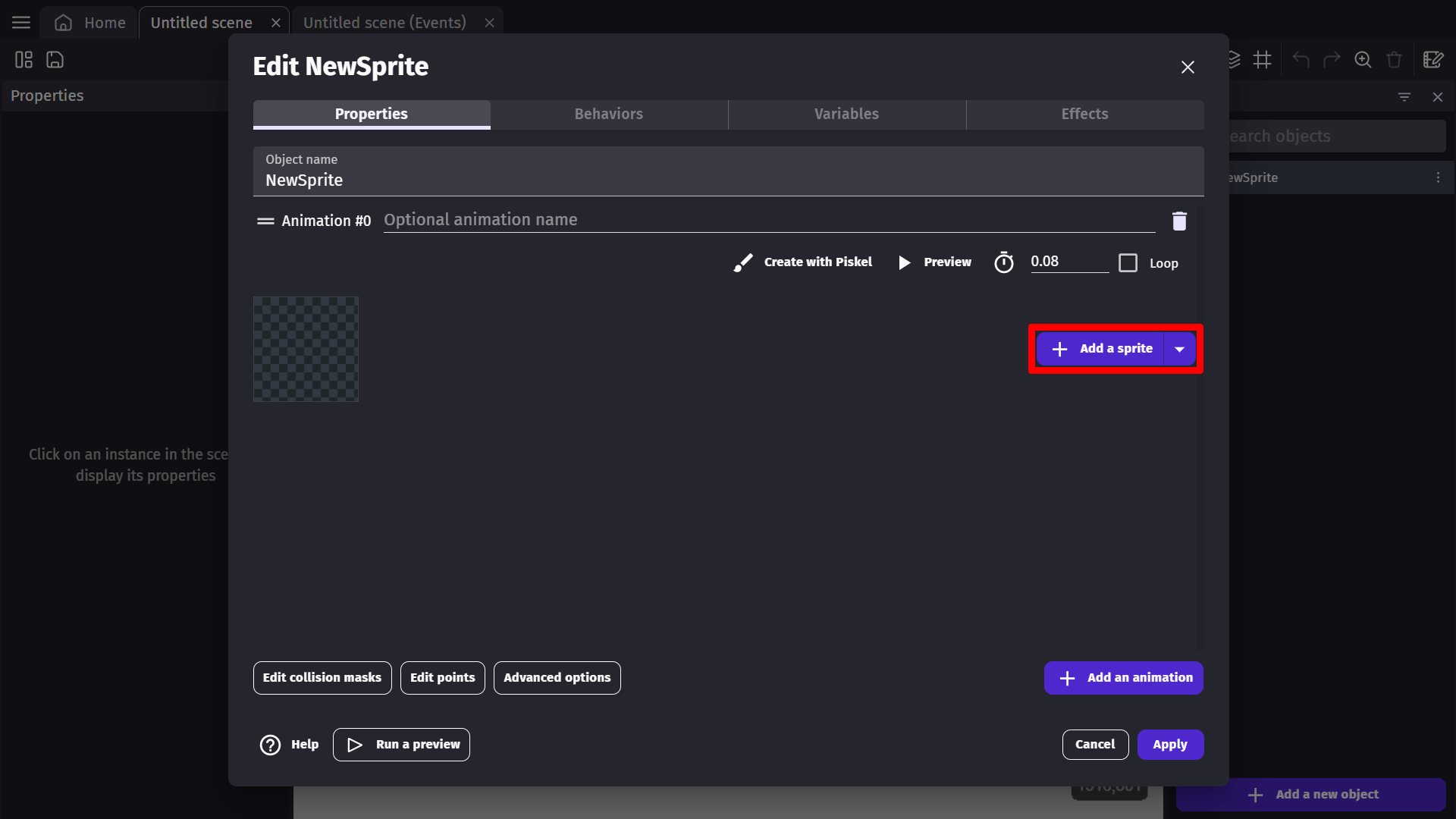 We can add images to the animation of our object by clicking Add a Sprite.