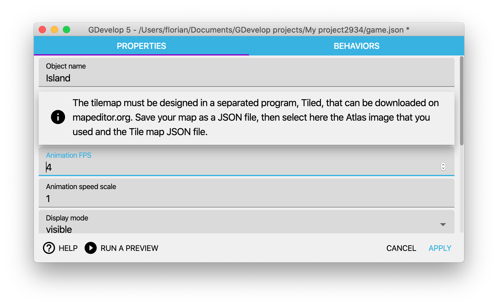 Finally, choose the tileset file in GDevelop, in addition to choosing the atlas image and the tilemap JSON file: