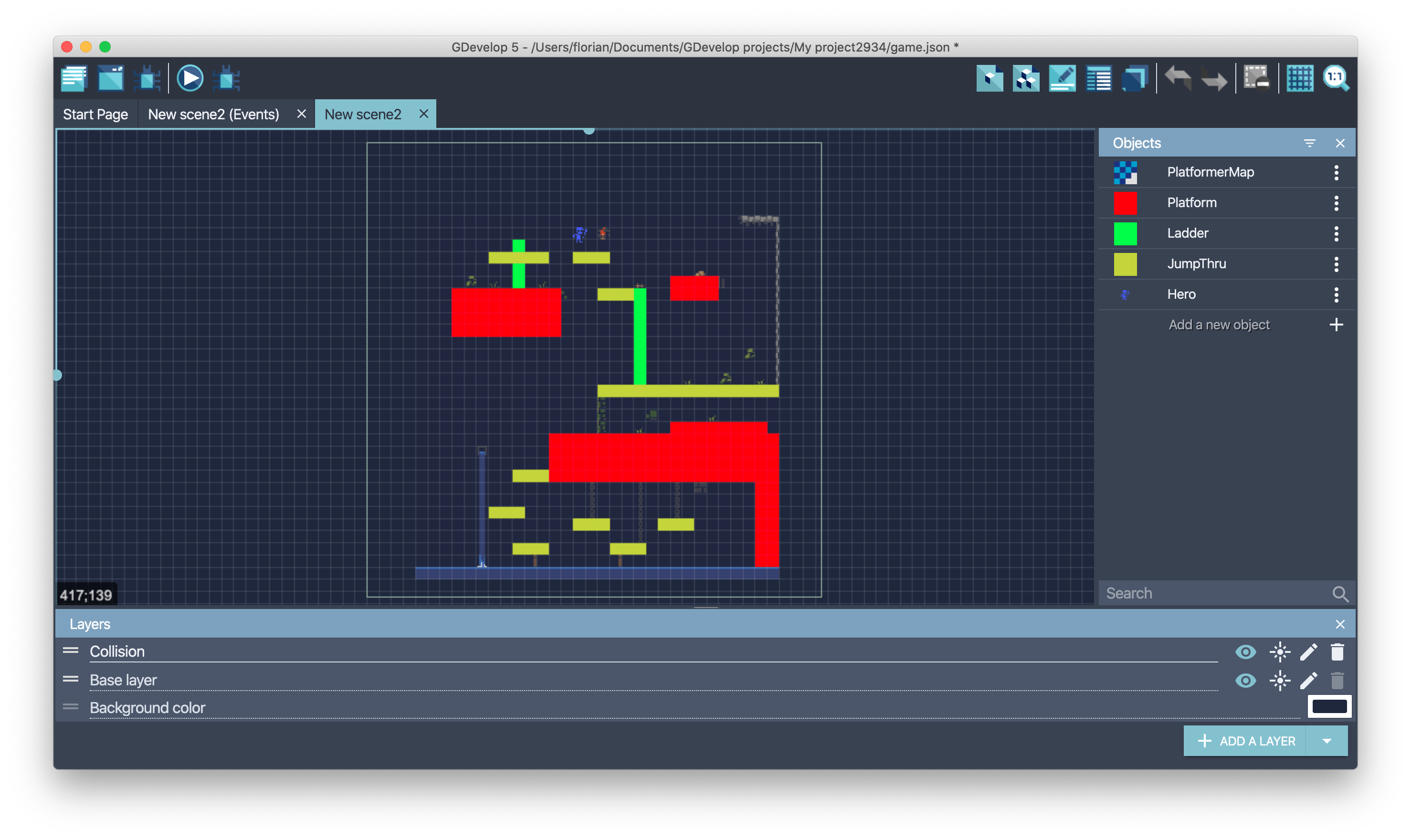 A platformer game often needs different kind of objects like platforms, jumpthru or ladders. One collision mask should be created for each kind. The example in the following screenshots can be opened in the online editor (open the project).
