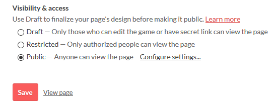 Finally, you want to click on the save and view page button. After it should load a preview of the page of our game and if we did it right, our browser game should start playing.