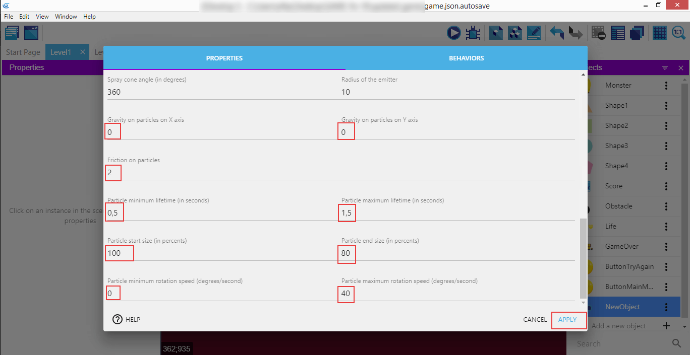 Scroll down even more. Set the gravity on particles on both X and Y axes to 0 (we don't need gravity in our game), friction on particles to 2, particle minimum lifetime to 0,5 seconds and the maximum one to 1,5 seconds, particle start size to 100 and end size to 80 (so they get a little smaller after they are spawned), minimum rotation speed to 0 and maximum to 40 degrees per second (so some of them can rotate a bit).