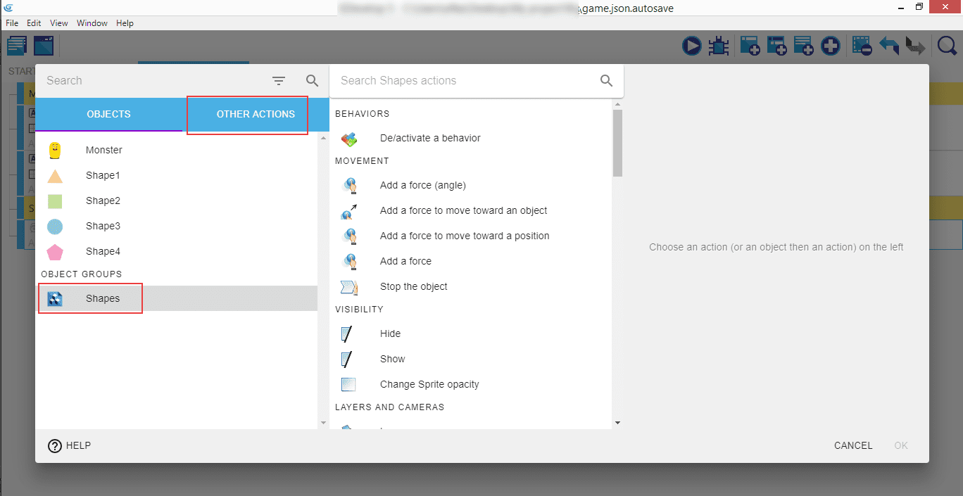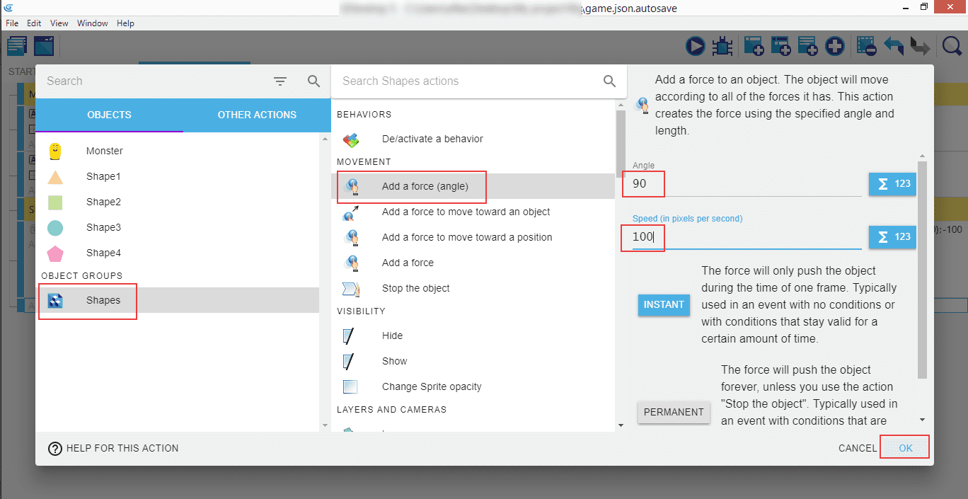 Add an action: select "Shapes", then "Add a force (angle)", and set the "Angle" to 90, and "Speed in pixels per second)" to 100.