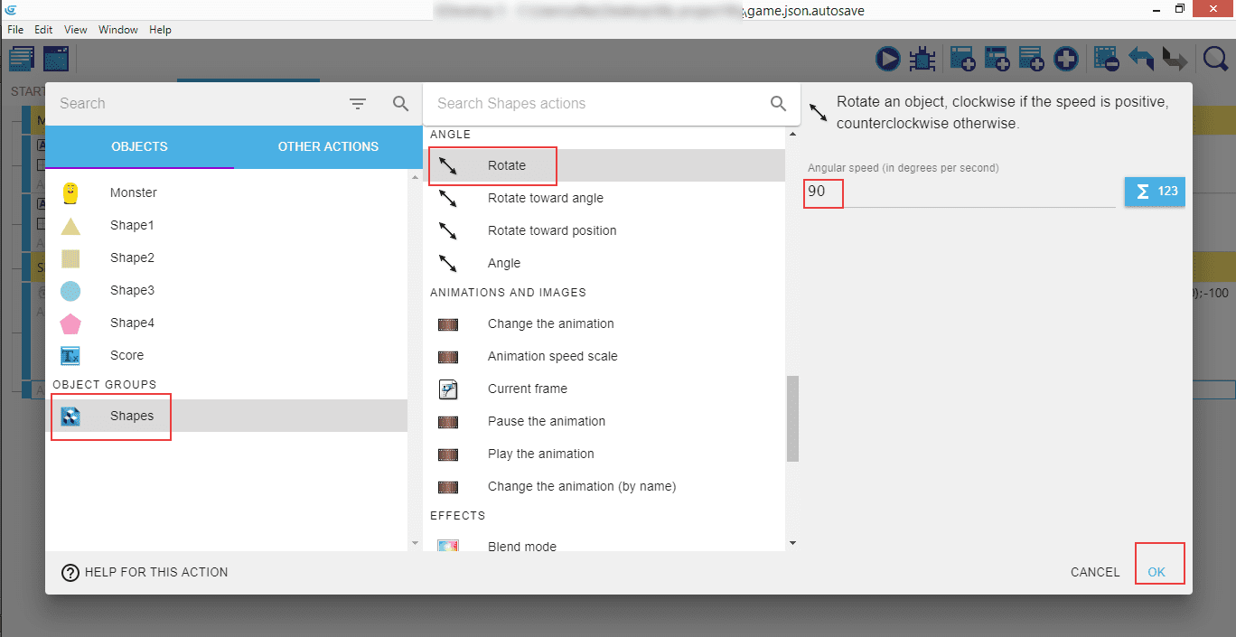 Add another action: "Shapes", then "Rotate", and set the "Angular speed (in degrees per second)" to 90.