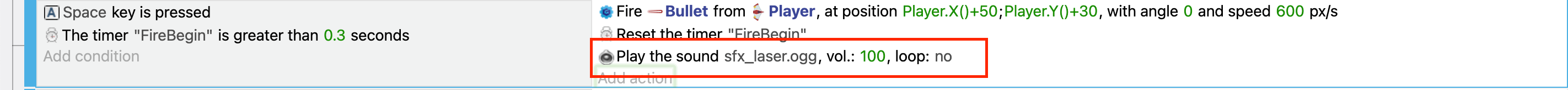 We will add a laser sound effect that will be played when the player fires a bullet. Go to the FireBegin event. Add a new action to play a sound. Select "sfx_laser.ogg" from the assets folder, set volume to 100, and pitch to 1.